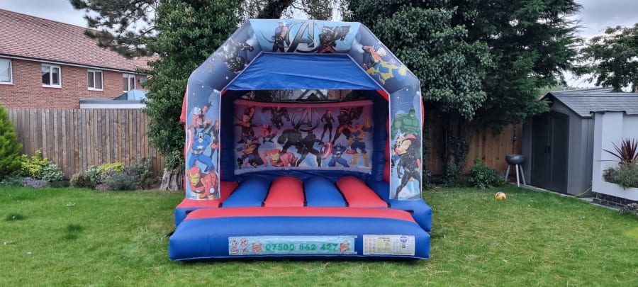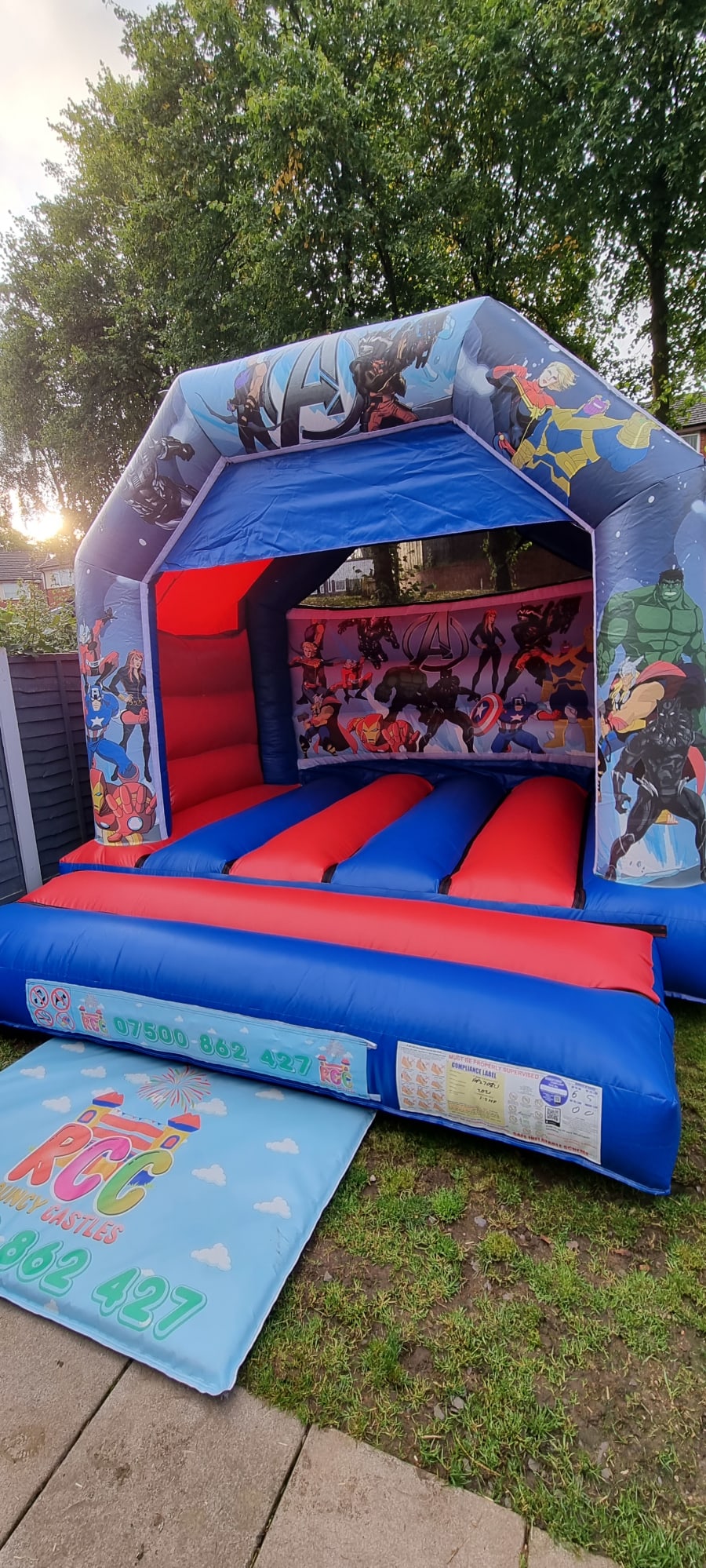 This is our 12ft x 12ft Marvel Castle and is a beautiful castle to enjoy any day. all of our castles are regularly checked and tested and also cleaned before or after every use as we pride ourselves on delivering the best products but also as standard they will come spotless and set up safe every time. all of our castles come with a rain cover as standard to protect from light showers.