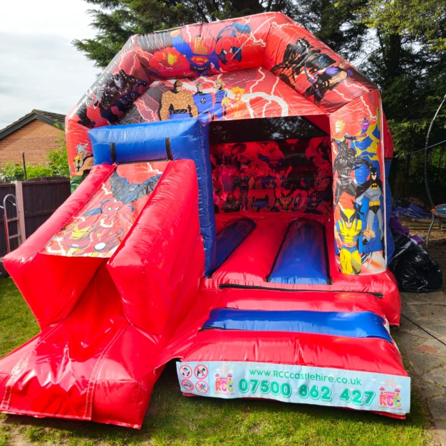 This is our new Superheroes Slide castle. it is 12ft in width and 18ft in length, which gives plenty of bouncing space. this is an amazing castle and definitely worth upgrading from a standard castle to this for just an extra £15.